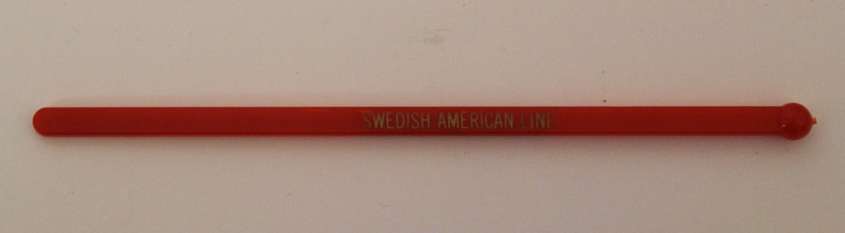 Drinkpinne av röd plast. Använd ombord Svenska Amerika Liniens fartyg.