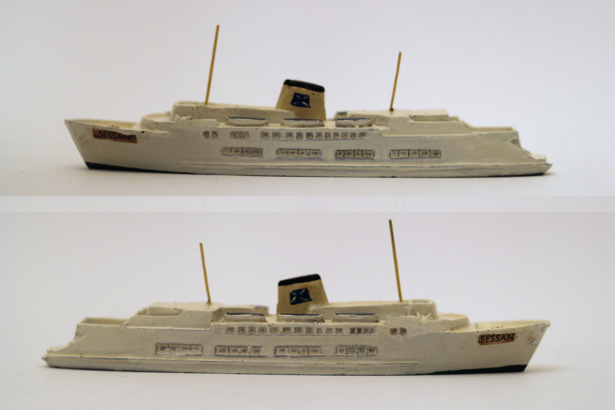 Miniatyrmodell gjuten i metall. Målad i vitt, grönt, blått, gult, grått och svart. I fören finns två etiketter märkta SESSAN.