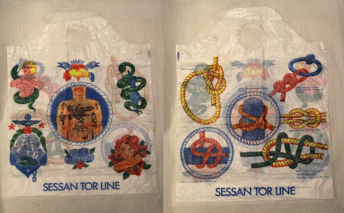 Vit plastpåse med reklamtryck för Sessanlinjen i flerfärgstryck föreställande tatueringar och knopar och texten Sessan Tor Line.