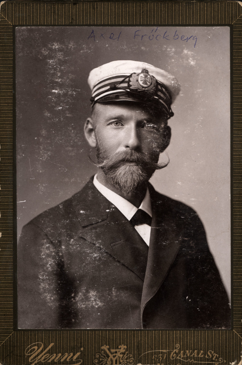 Studioporträtt av sjökapten Axel Fröckberg. På fotografiet är han iklädd uniformsmössa och sannolikt även uniforms kavaj. Fotografiet är taget hos en fotografistudio i New Orleans och är sannolikt taget under 1880-talet, då Axel arbetade som befälhavare ombord Rederi AB Örnens segelfartyg.