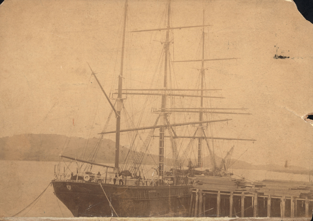 Den tremastade barken ALBATROSS liggandes vid kaj i Nya Zeeland. Fartyget håller här på att lasta trä som ska till Hull i England.