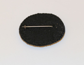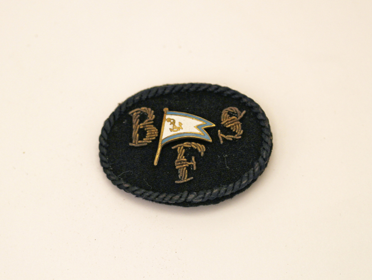 Ovalt mössmärke av mörkblå filt med snodd runt kanten. På framsidan finns BSF broderat i guldfärgad tråd samt en vimpel i metall, vit och ljusblå med ett ankare på. På baksidan finns en säkerhetsnål i metall.