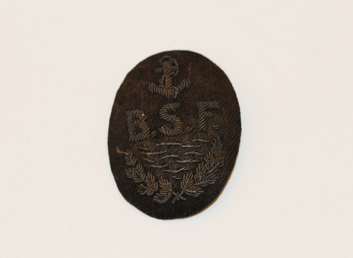 Ovalt förtjänstmärke i mörkblå textil. På framsidan finns BSF broderat samt ett ankare, vågor och två korsade blomsterkvistar. På baksidan finns en säkerhetsnål i metall.