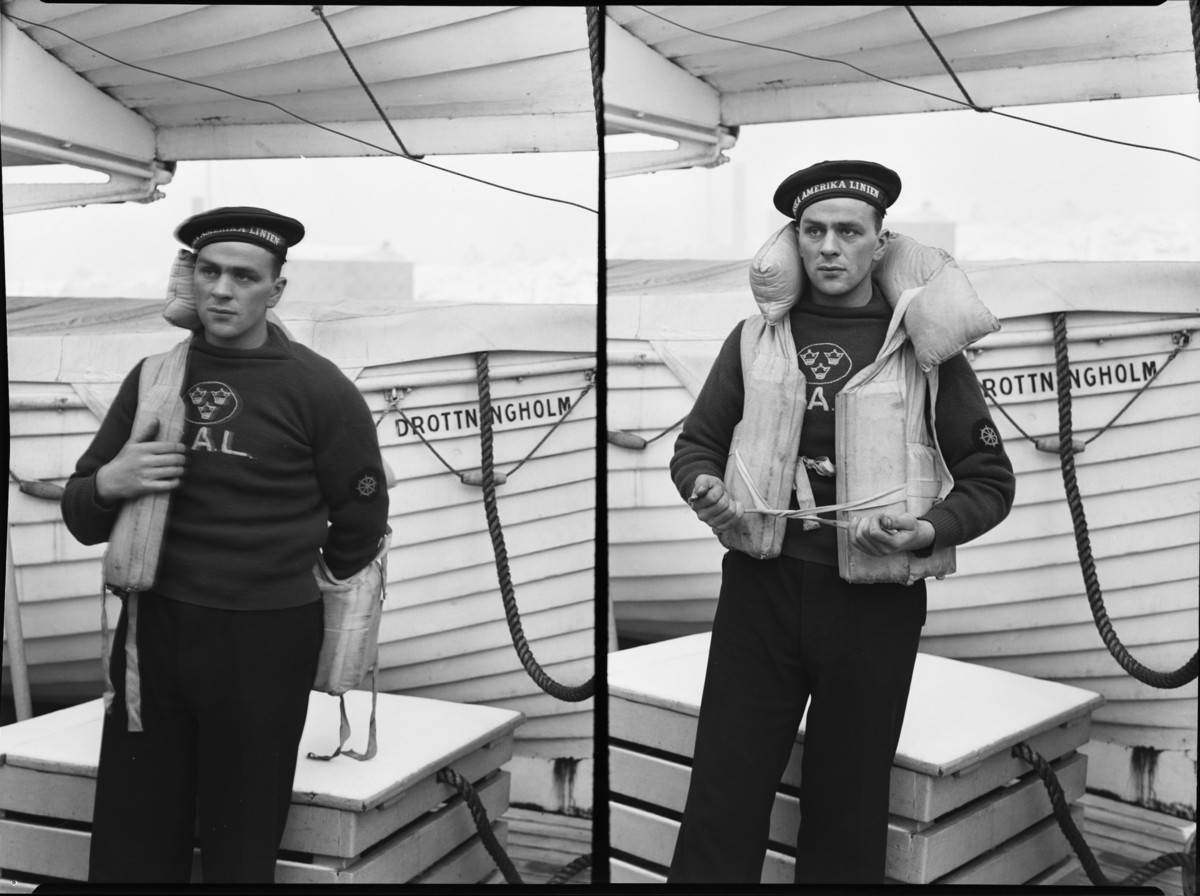 Besättningsman på DROTTNINGHOLM provar livbälte