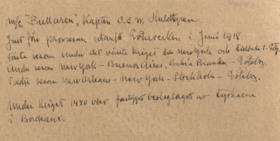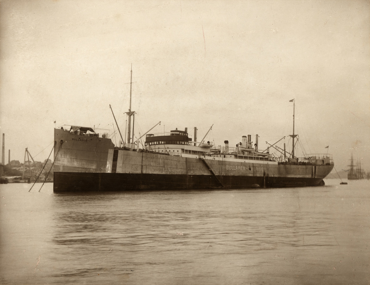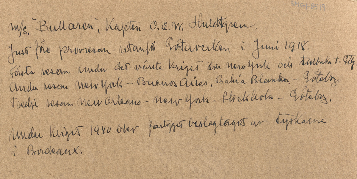 Påskrift: m/s Bullaren, Kapten O.E.W. Huldtgren. Just för provresan utanför Götaverken i juni 1918. Första resan under det värsta kriget till New York och tillbaka till Gbg. Andra resan New York-Buenos Aires, Bahia Blanka-Göteborg. Tredje resan New Orleans-New York.Stockholm-Göteborg. Under kriget 1940 blev fartyget beslagtaget av tyskarna i Bordeaux.