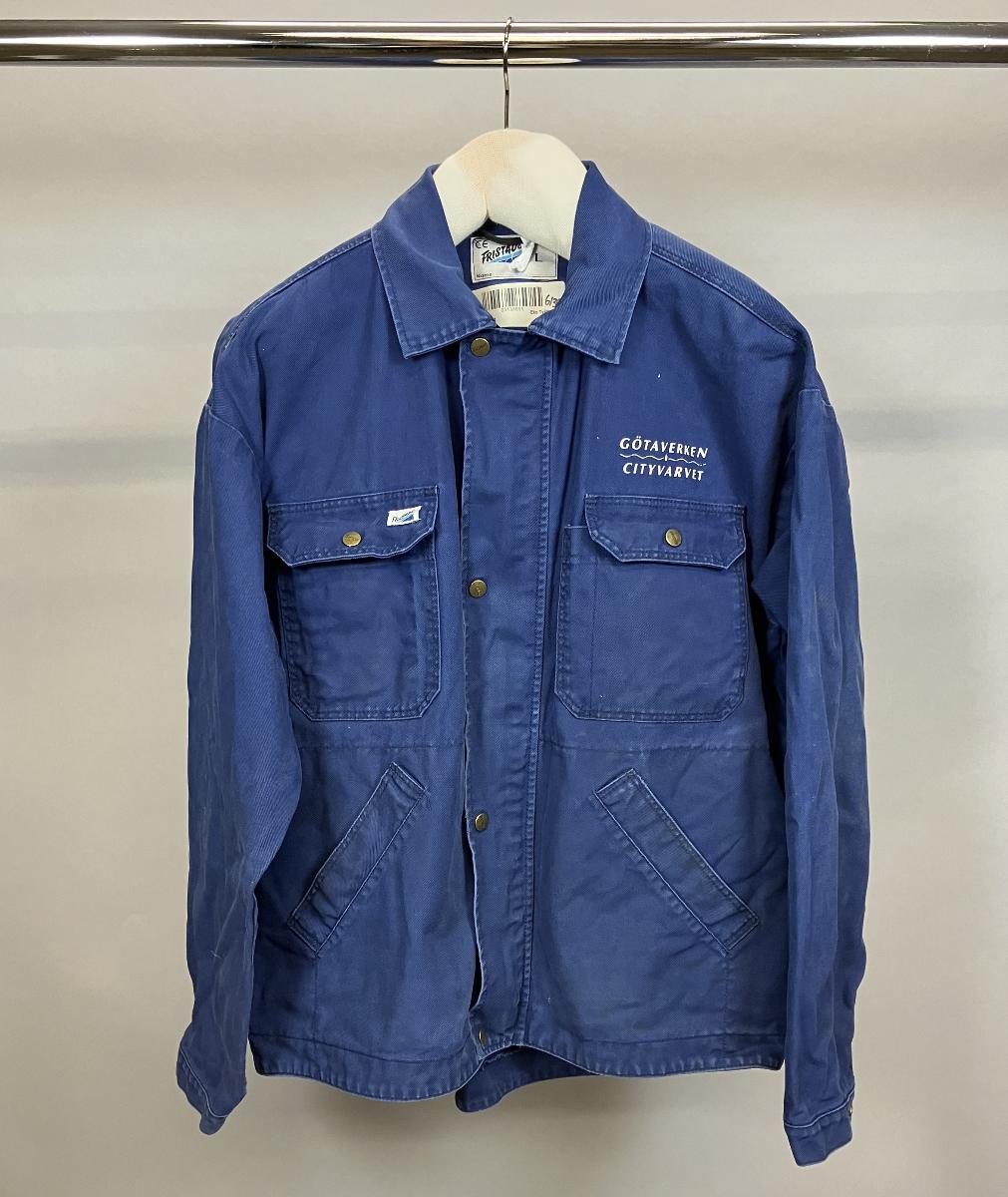 Arbetsjacka med lång ärm i mörkblå bomull, med fyra fickor framtill och dragkedjeknäppning i plast. Jackan har även tryckknappar i metall framtill, märkta med namnet på tillverkaren Fristads. Götaverken Cityvarvet står tryckt över ryggen samt ovanför den vänstra bröstfickan. Tvättmärkning på insidan, i nacken