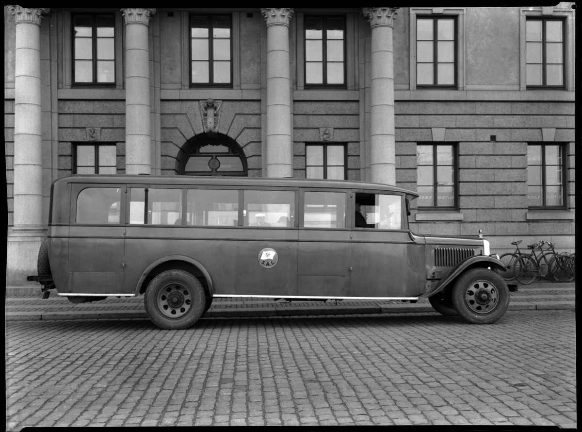 Bil tillhörande SAL. Användes för transport av passagerare (sannolikt endast 1a klass passagerare) till Amerikaskjulet därifrån SALs fartyg avgick. Bilen syns här utanför hotell Göta Källare som SAL inköpt 1921. Hotellet låg vid Hotellplatsen vid Kvarnbron (när dagens Nordstan, korsningen Södra Hamngatan/Östra Larmgatan) och var i SALs ägo fram till 31 juli 1944.