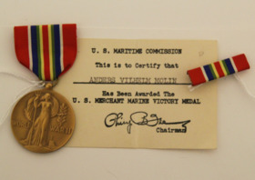 Medaljen kallas Merchant Marine World War II Victory Medal och delades ut av den Amerikanska handelsflottan till sjömän som arbetat inom eller för denna, på fartyg under amerikansk flagg, under minst 30 dagar mellan 7 december 1941 och 3 september 1945. Den infördes efter ett kongressbeslut 8 augusti 1946 för att hedra sjömän som arbetat under farliga förhållanden under andra världskriget. Medaljen designades av John Sinnock vid Amerikanska myntverket.