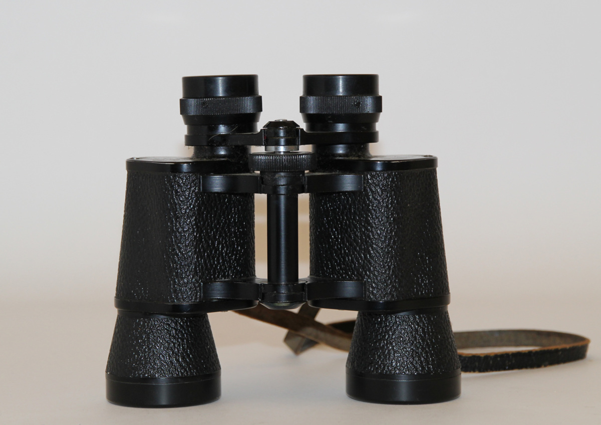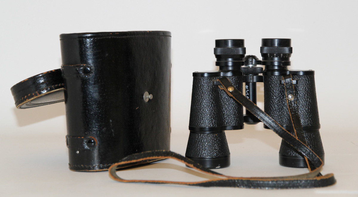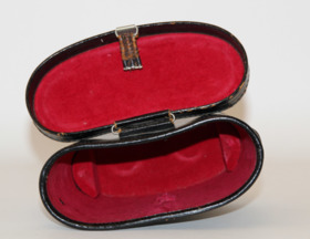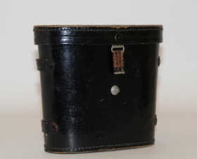 Svart kikare med en halsrem i läder. Förvaras i ett svart läderetui med ett trasigt spänne, insidan i röd sammet.
