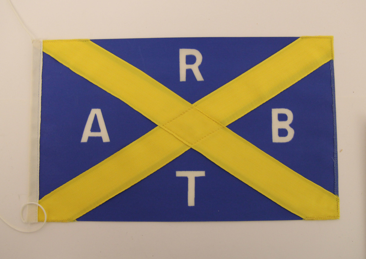 Rederiet Transatlantics flagga i syntetmaterial. Blå botten med ett gult kryss och bokstäverna RABT i vitt.