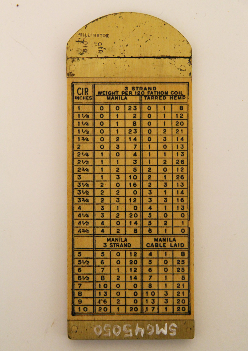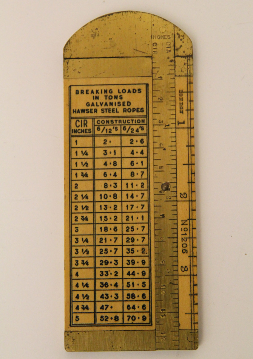 Måttsticka med skjutmått för att kunna beräkna bärigheten av vajer och tågvirke. Måttet är försedd med flera tryckta omvandlingstabeller i svart tryck.