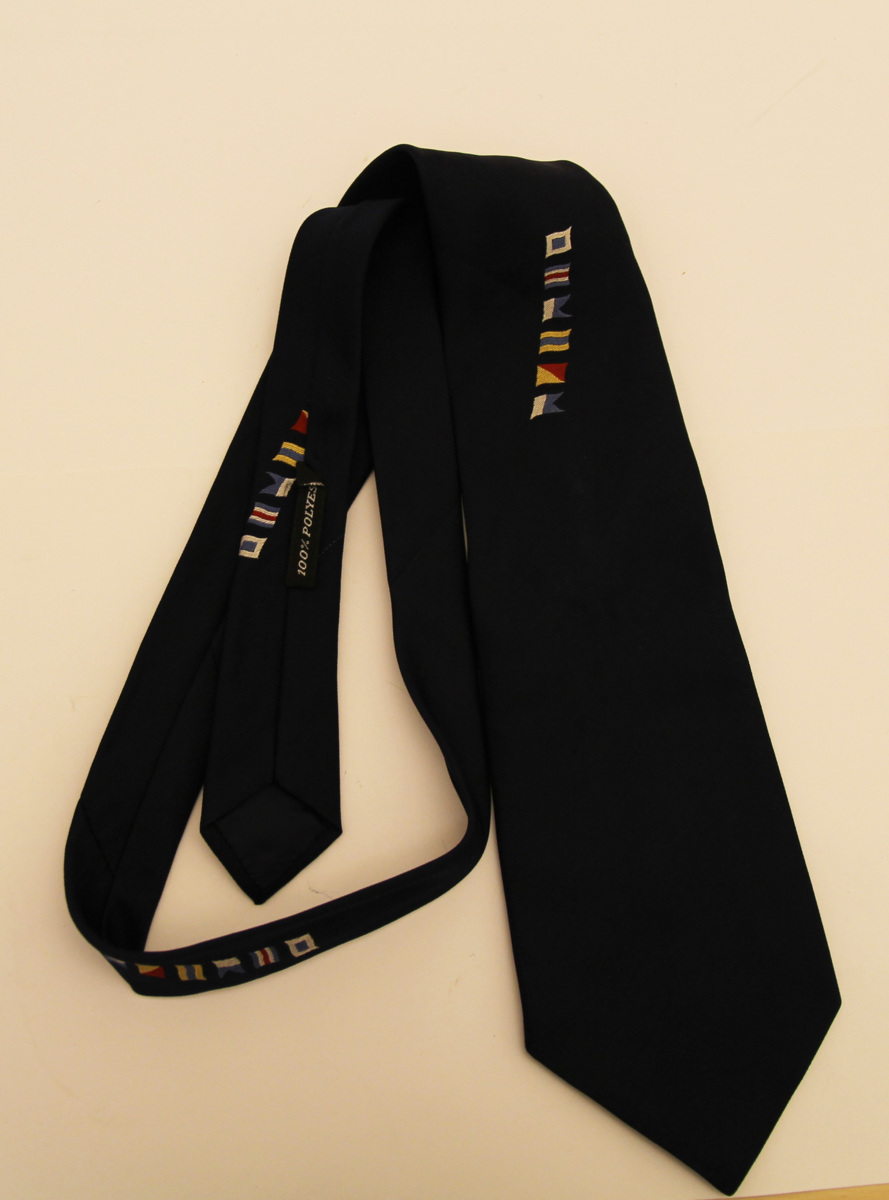 Mörkblå slips med invävt mönster föreställande sex signalflaggor för bokstäverna S C A D O A.