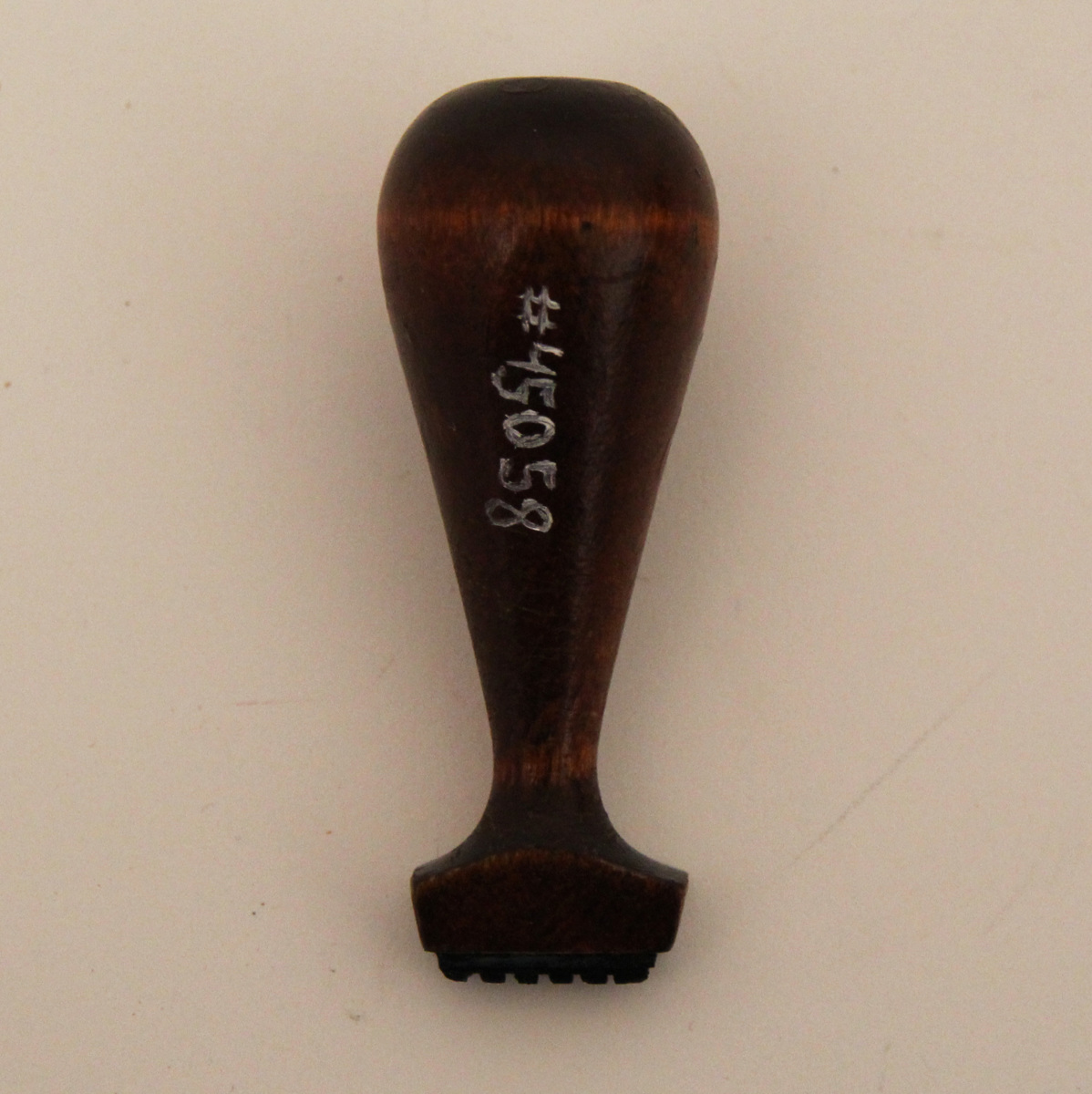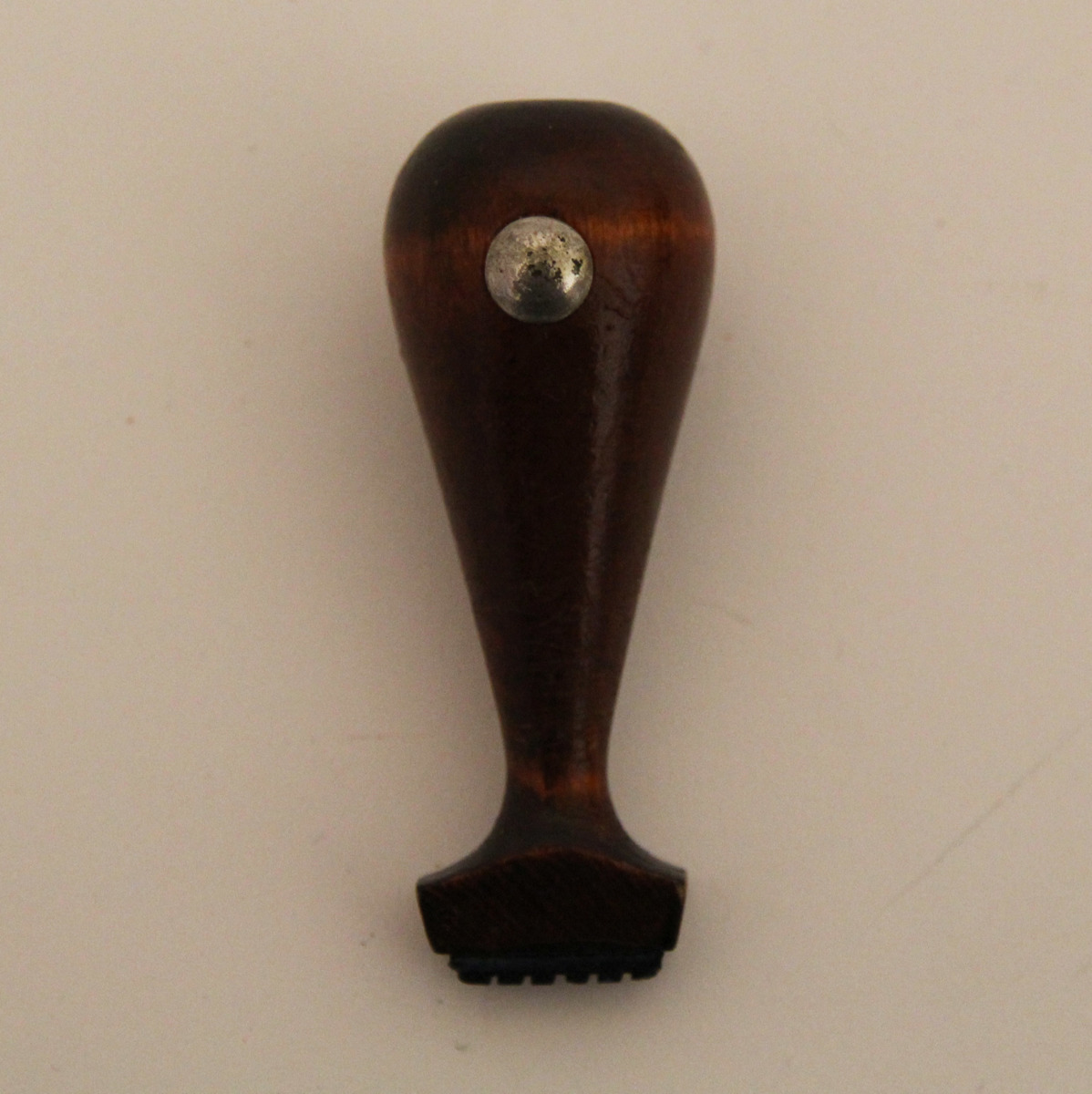 Stämpel med träskaft och gummidyna. På skaftet finns en dekorspik som indikerar vilket håll man ska hålla stämpeln.