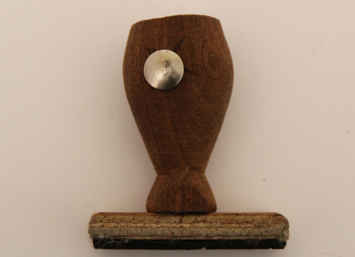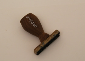 Stämpel med handsnidat skaft av trä och stämpeldyna av gummi. På skaftet finns en dekorspik som indikerar hur stämpel ska hållas för att texten ska bli rätt. Stämpeln tillverkades av Karl Persson som ett skämt för sin fru Sonja Persson som följt med honom på en resa.
