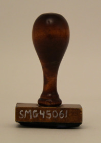 Stämpel med träskaft med handgjord gummidyna föreställande brukarens signatur.