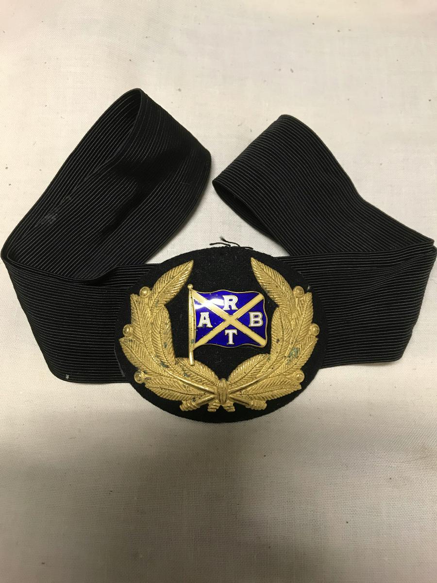 Mössmärke i svart ylletyg med guldfärgad metall i form av en lagerkrans samt ett emaljerat metallmärke föreställande Transatlantics rederiflagga i blått, gult och vitt. Mössmärket sitter fast på ett svart hattband.