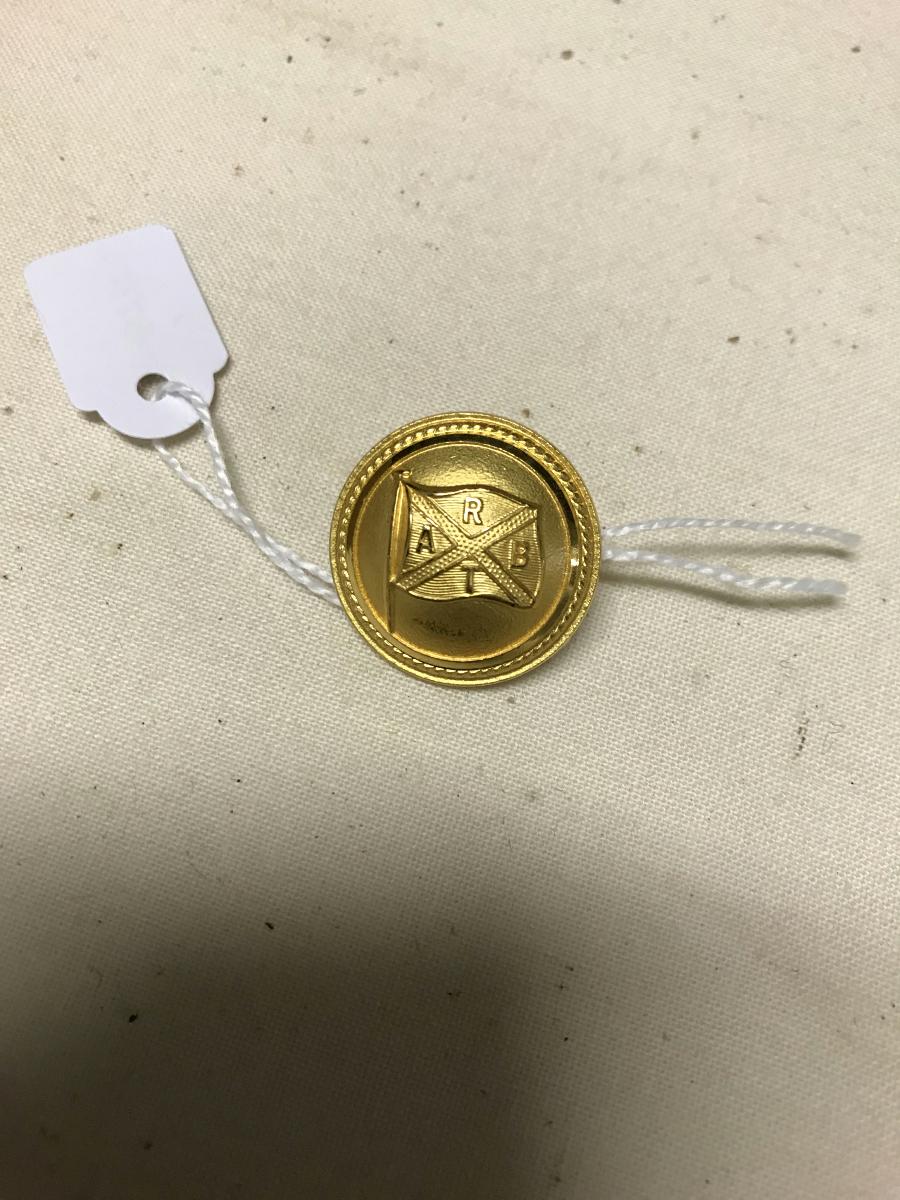 17 stycken stora kavajknappar i guldfärgad metall med Transatlantics rederiflagga i relief.