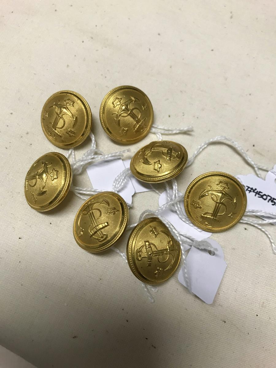 Sju stycken stora kavajknappar i guldfärgad metall med ett ankare och tre kronor i relief.