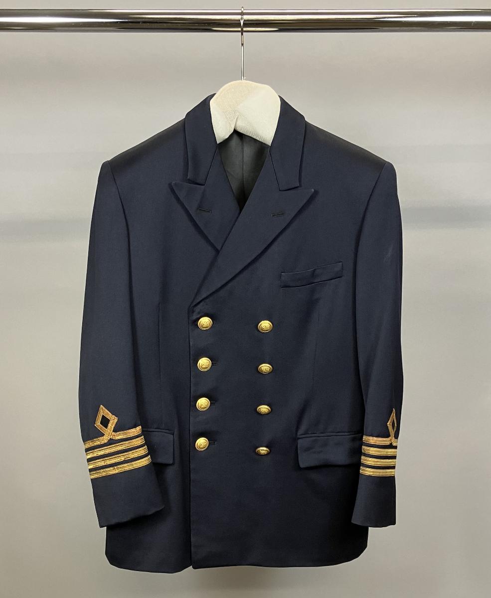 En åttaknäppt mörkblå kavaj i syntettyg med mässingsknappar och gradbeteckningen för sjökapten på ärmarna.
