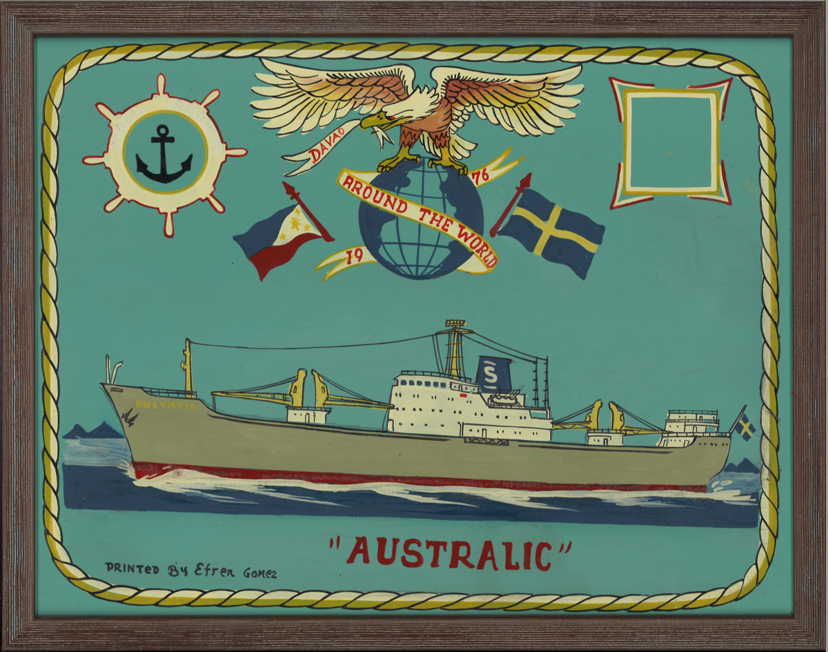 Fartygsporträtt i en mörkbrun träram. Dessa typer av tavlor målades i olika hamnar av lokala konstnärer och såldes som souvenirer till sjömän. Liknande tavlor men med andra motiv såldet till turister.