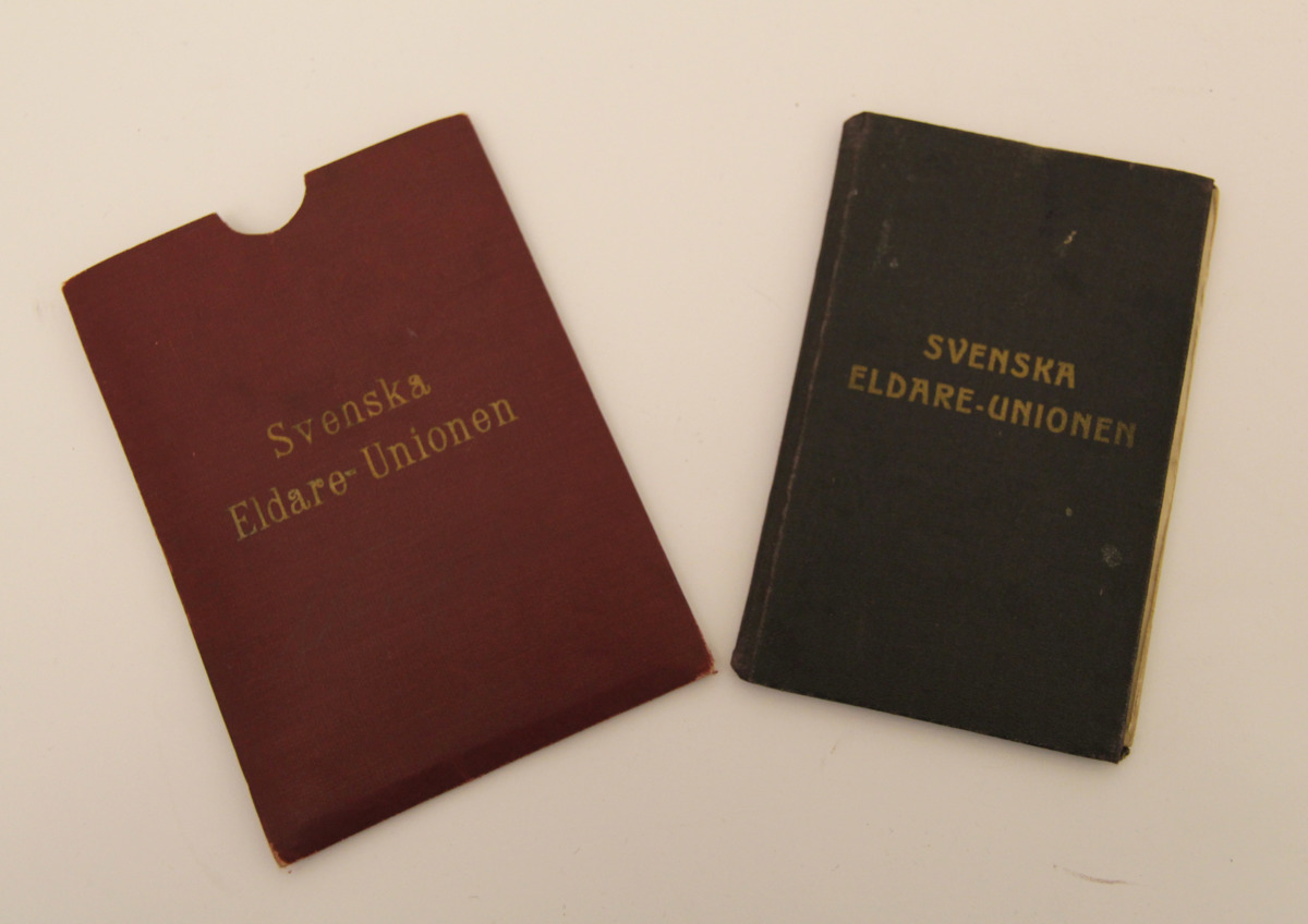 Medlemsbok i svart konstläder med tryckt text i guldfärg. Boken har ett pappomslag klädd i vinröd konstläder med text i guldfärg.