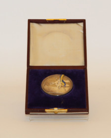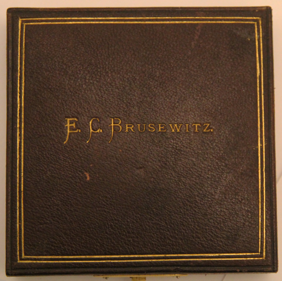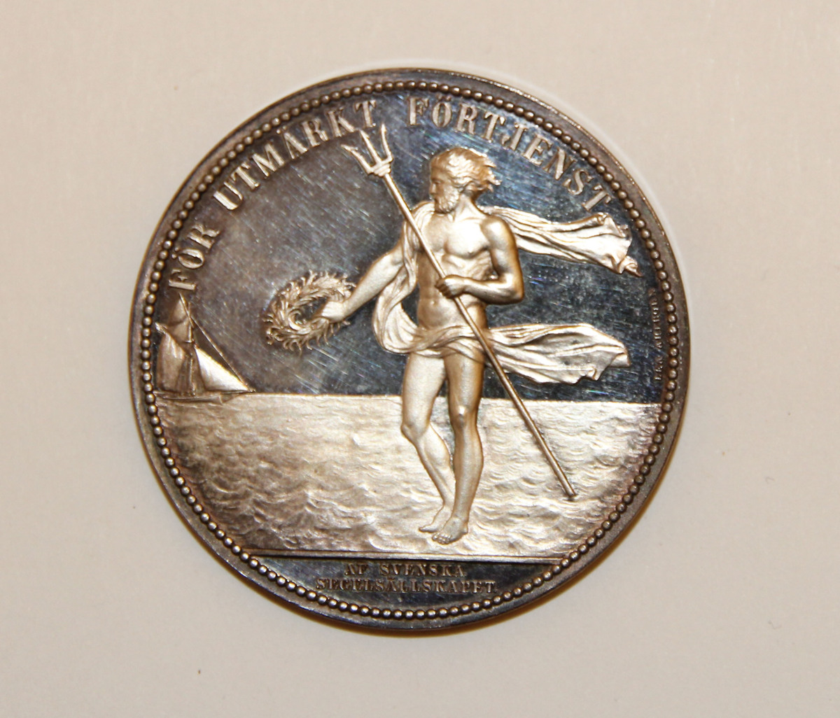 Medalj i ask, utdelad av KSSS till Eric Cornelis Brusewitz förutmärkt förtjänst. Medaljen är av silver och försvaras nedsänkt i en brun läderask som är klädd med blå sammet och beigt siden. På medaljens ovansida finns ett porträtt i profil och relief av Kung Oscar I, en av KSSS stiftare. På undersidan finns en scen med vatten och en segelbåt samt en havsgud med treudd i ena handen och en krans i andra handen, allt också i relief.