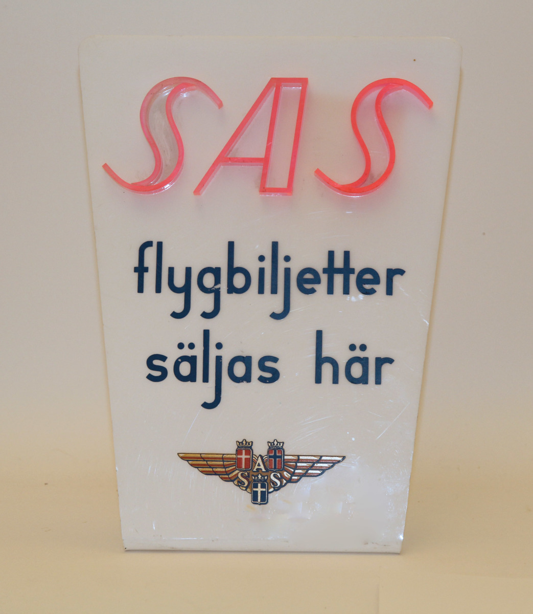 Informationsskylt i vit plexiplast med relief i rosa genomskinlig plexiplast "SAS". Skylten ska placeras på försäljningsdisken.