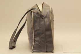 Axelremsväska i ljusgrå plast med detaljer i vitt och tryck i mörkblått och guld. I väskan låg ett reklamblad.
