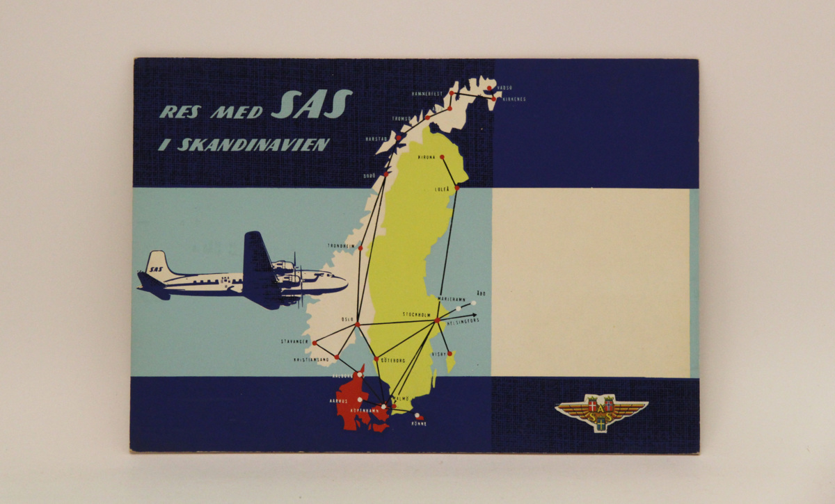 Reklamskylt för bord i fyrfärgstryck föreställande ett flygplan och en karta med Danmark, Norge, Sverige och flygrutterna som SAS flög.
