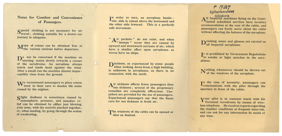 Tryckta förhållningsregler för passagerare ombord ett flygplan.