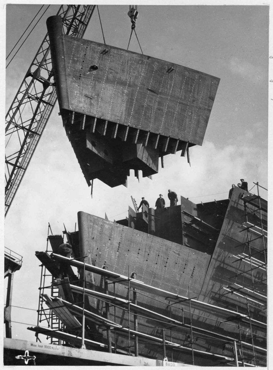 Bilden visar ett nitat fartyg, troligtvis 1940-tal, men illustrerar en byggmetod som kom att utvecklas ytterligare då svetsen infördes. Svetsningen var en språngbräda när det gällde att göra den svårrationaliserade plåthanteringen mera ’fabriksmässig’, den öppnade vägen för sektionsbyggeriet.