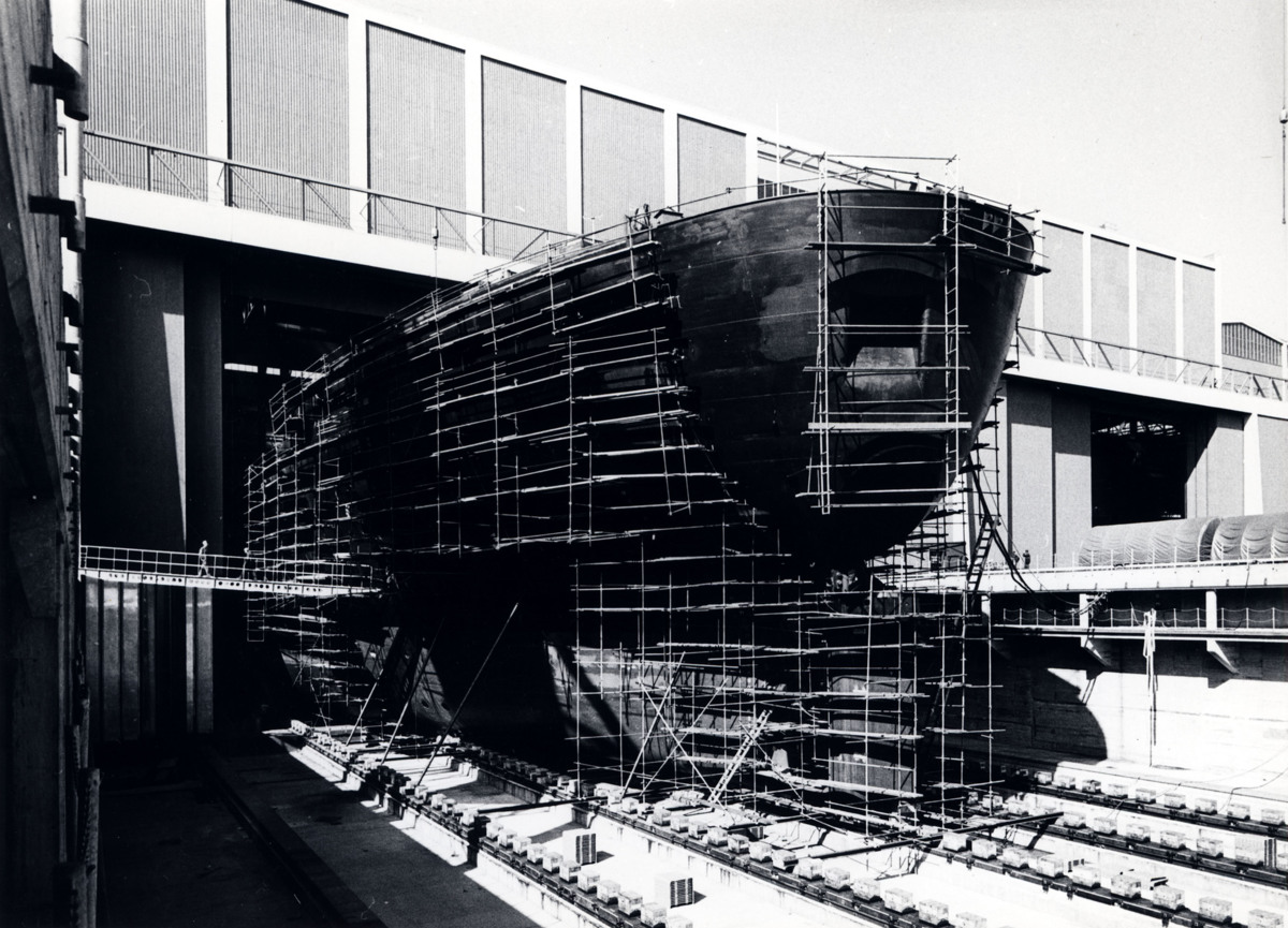 Fartyget på bilden byggs i den för 1960-talet nya tekniken där fartyg byggs sektion för sektion inomhus och skjuts ut varefter en sektion monterats.