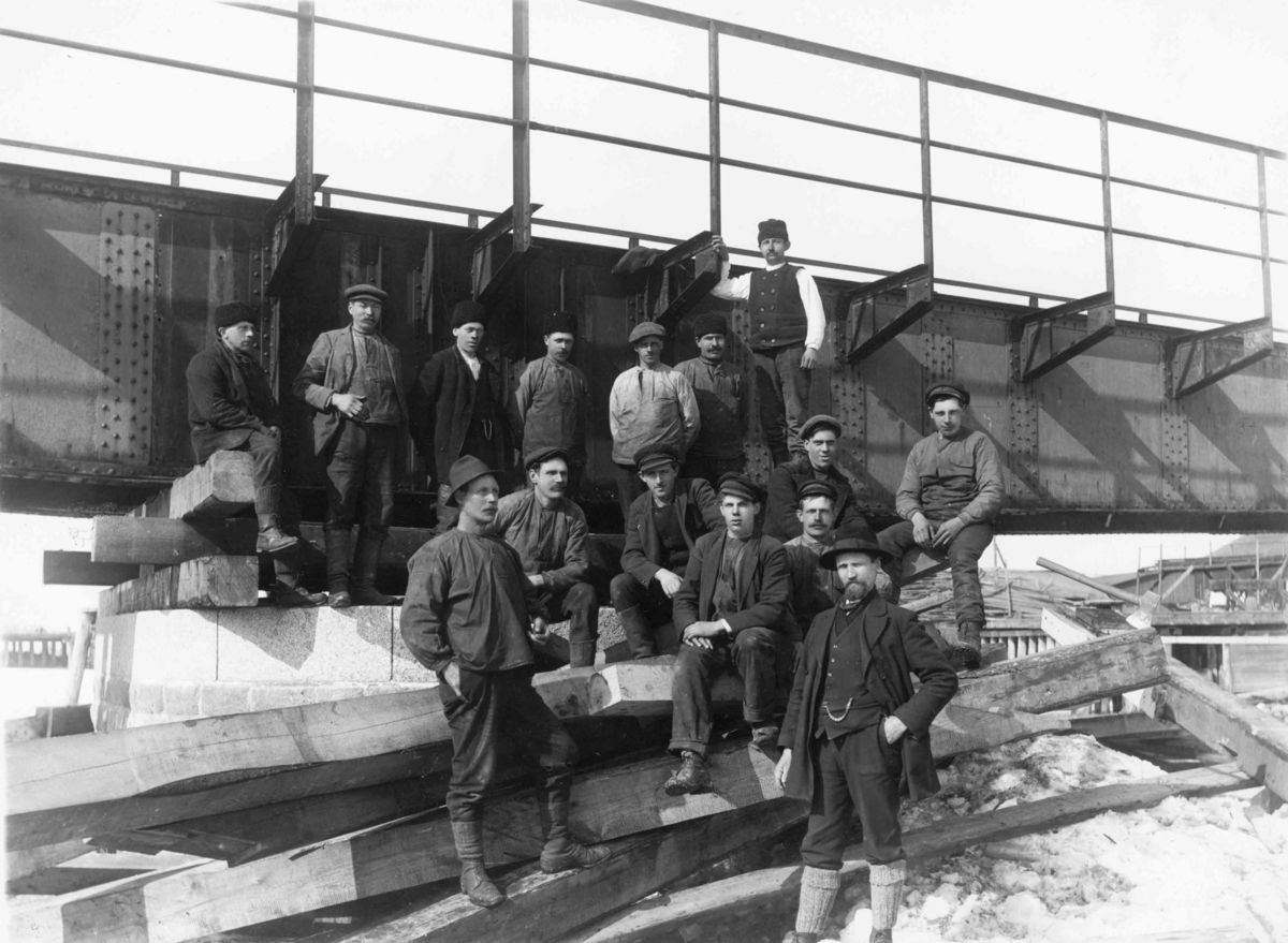Järnvägsarbetare som lägger järnvägsspår till Frihamnen står uppställda i anslutning till sin arbetsplats. Arbetet med järnvägen var klart 1921 och Frihamnen invigdes 1922.