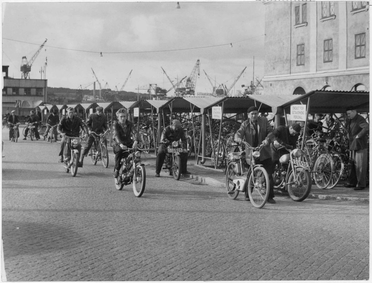 Arbetare från Götaverken på väg hem från jobbet vid cykelparkeringen vid Pustervik