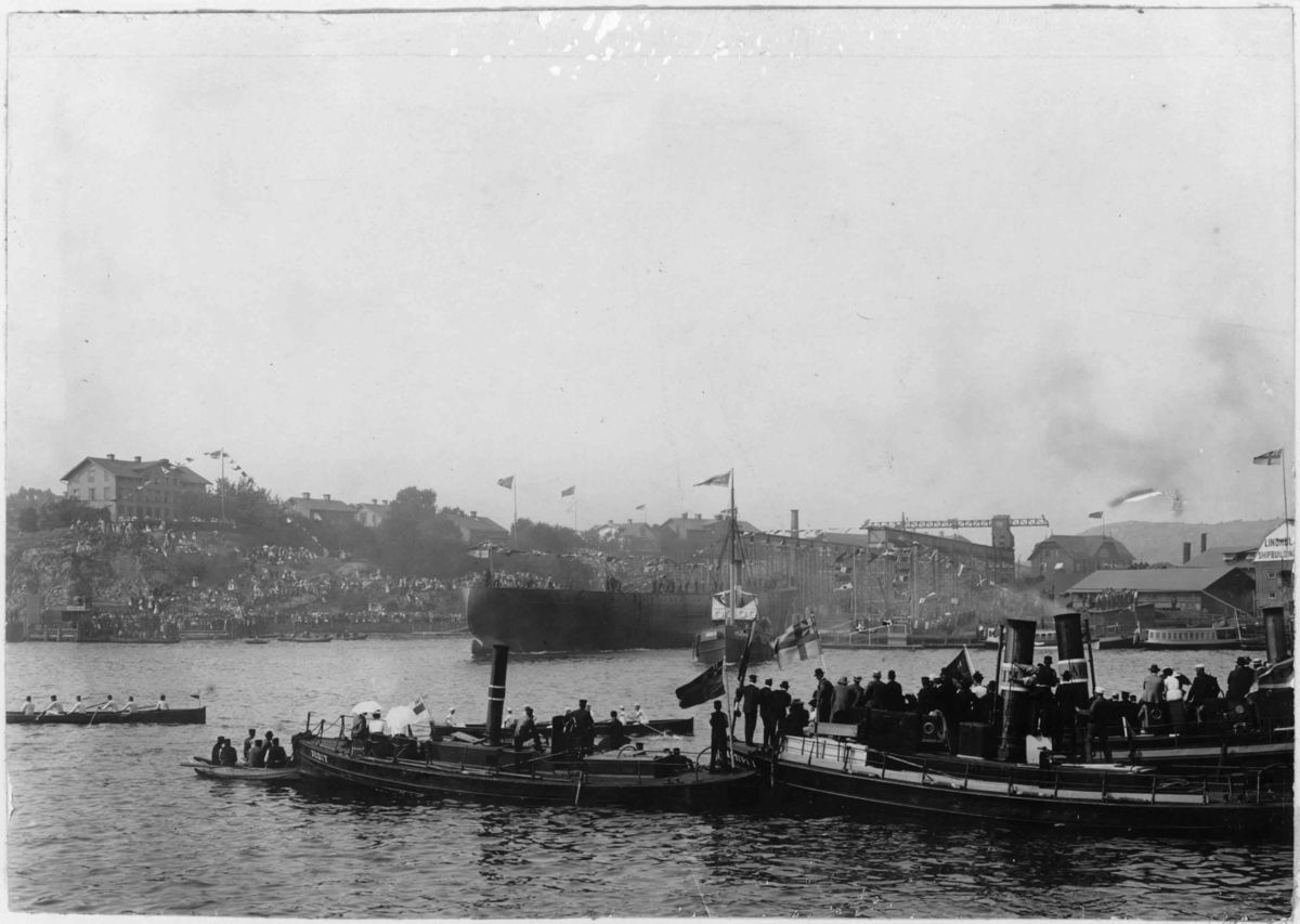 I förgrunden syns flera mindre ångbåtar och roddbåtar, alla fulla med människor som tittar på sjösättningen. Bogserbåten FÄRDIG skymtar i mitten av bilden.
