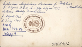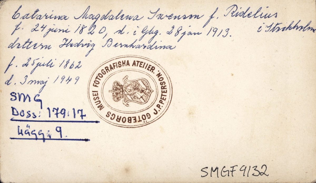 Påskrift: Catarina Magdalena Swensson f. Ridelius i Stockholm f. 24 juni 1820, d. i Gbg 28 jan 1913. Dottern Hedvig Bernhardina f. 25 juli 1862 d. 3 maj 1949
