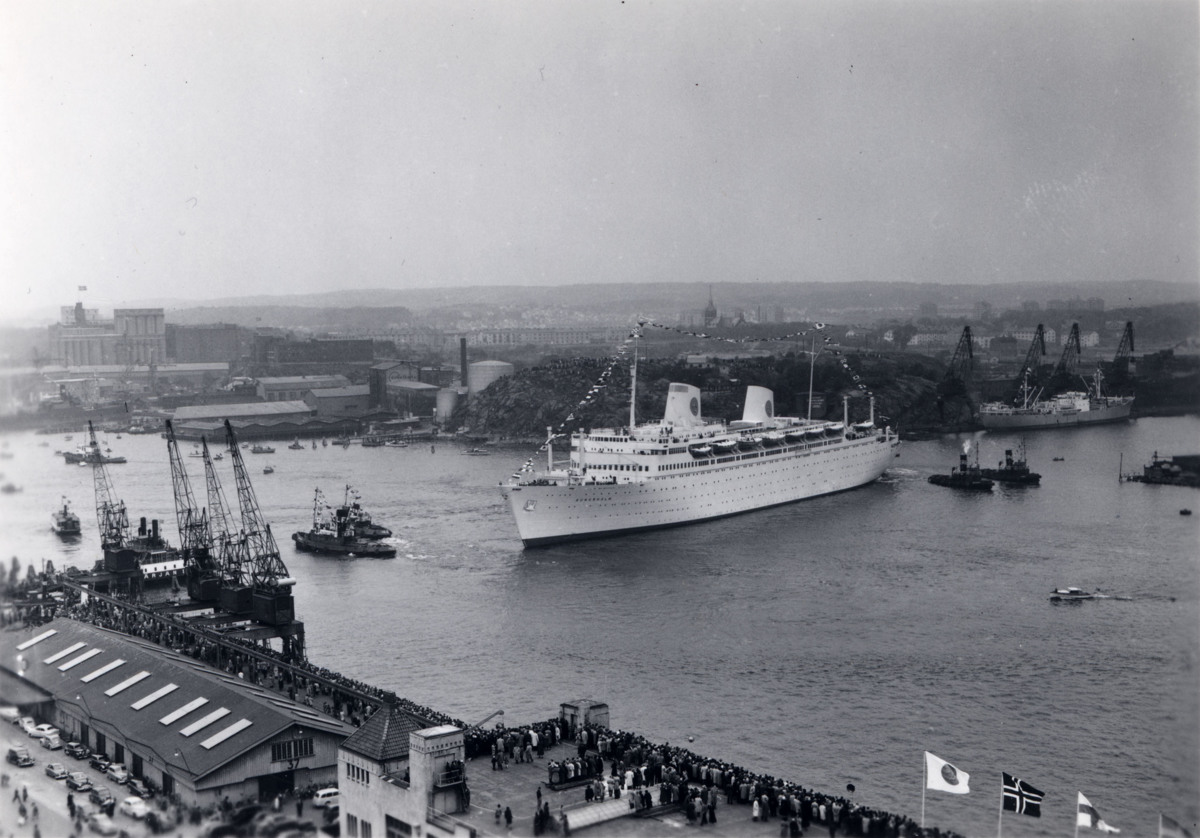 Fotografiet taget i oktober 1953. KUNGSHOLM har precis anlänt till Göteborg för första gången, direkt från varvet i Vlissingen i Holland. I nederkant skymtar toppen av Amerikaskjulet med folksamling. I bakgrunden syns Eriksbergsvarvet och delar av Hisingen