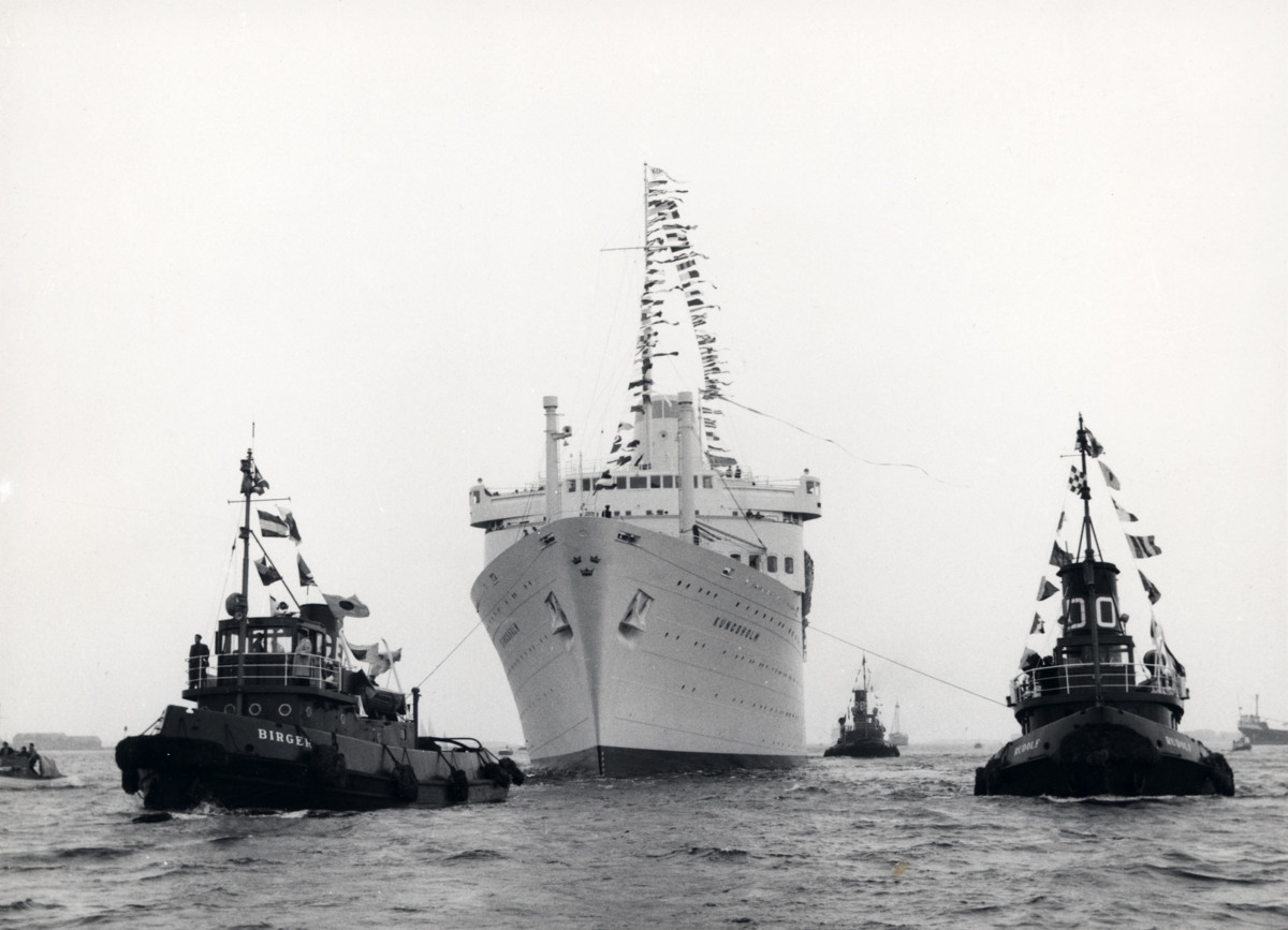 Fotografiet taget 11 oktober 1953. KUNGSHOLM har precis anlänt till Göteborg för första gången, direkt från varvet i Vlissingen i Holland. På detta fotografi bogseras fartyget av två bogserbåtar.