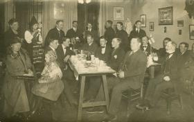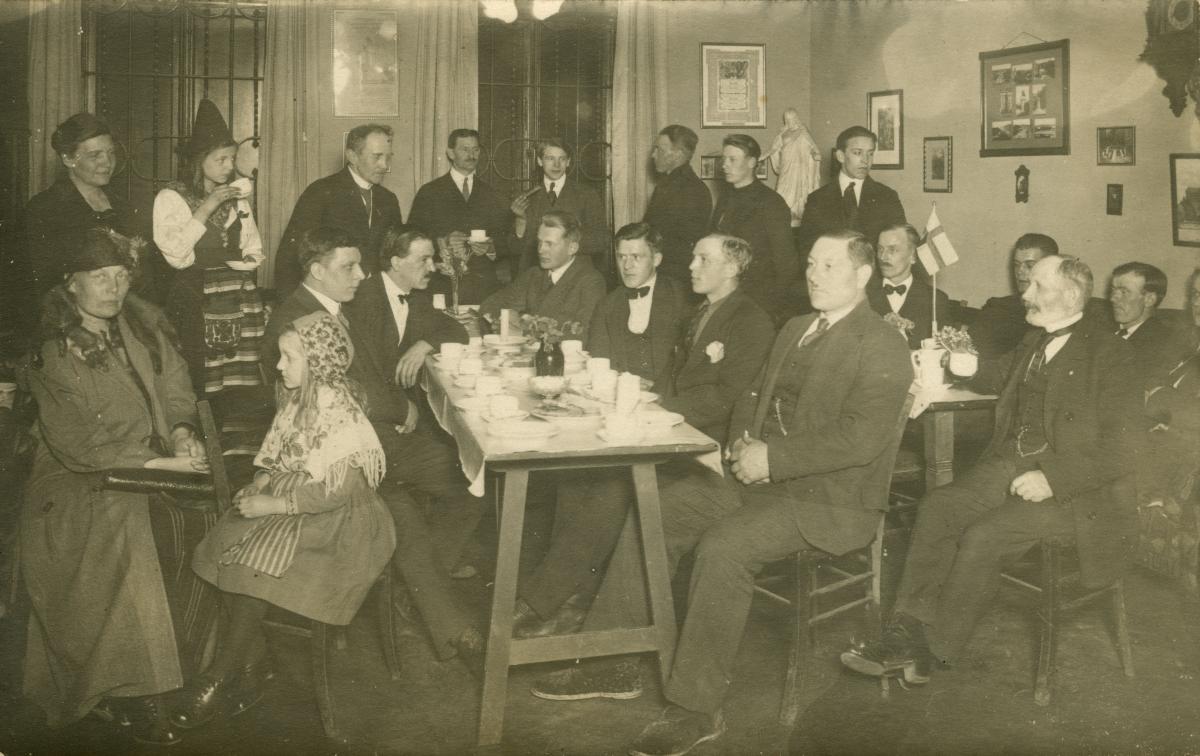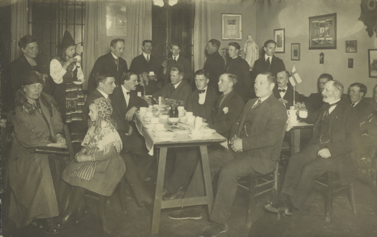 Troligen föreställer fotografiet människor på Svenska Sjömanskyrkan i Antwerpen någon gång på 1920-talet. Sjömannen Karl Anton Lindvall är med på bilden, troligtvis sittandes till vänster om bordsflaggan.