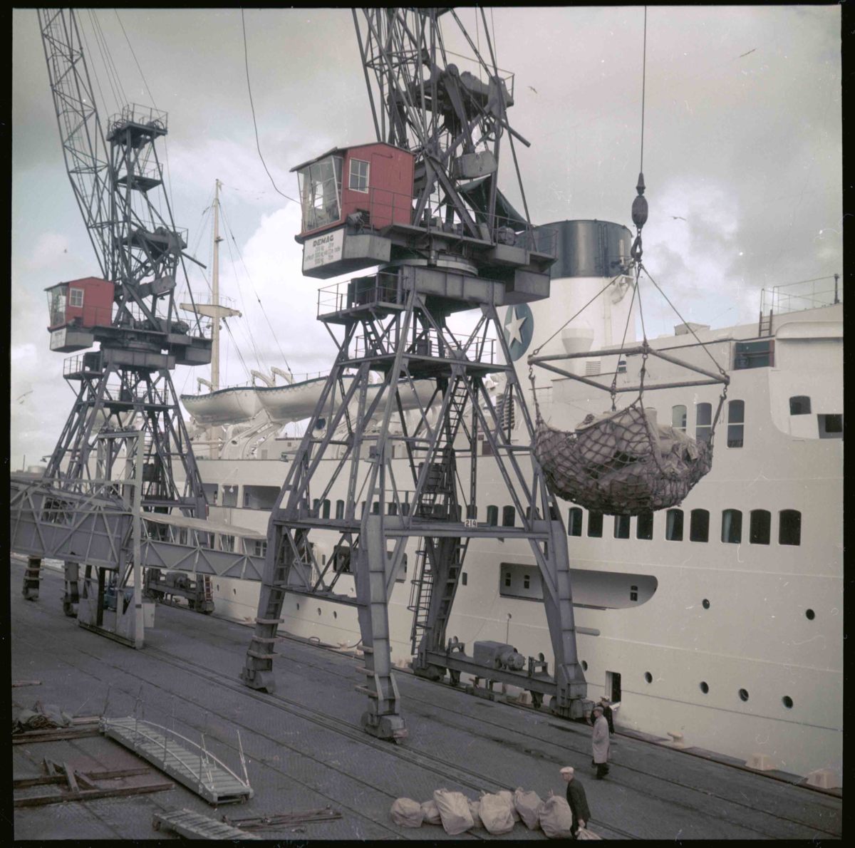 Tillhör en samling bilder under rubriken "Till England med Svenska Lloyd". På denna bild håller varor på att lastas av eller på ett av Svenska Lloyds fartyg. Fartyget som syns på bilden är sannolikt PATRICIA byggd 1951 eller SAGA byggd 1946. På kajen står några personer och tittar på. Fotografiet är sannolikt taget i närheten av Majnabbeterminalen i Göteborgs hamn.