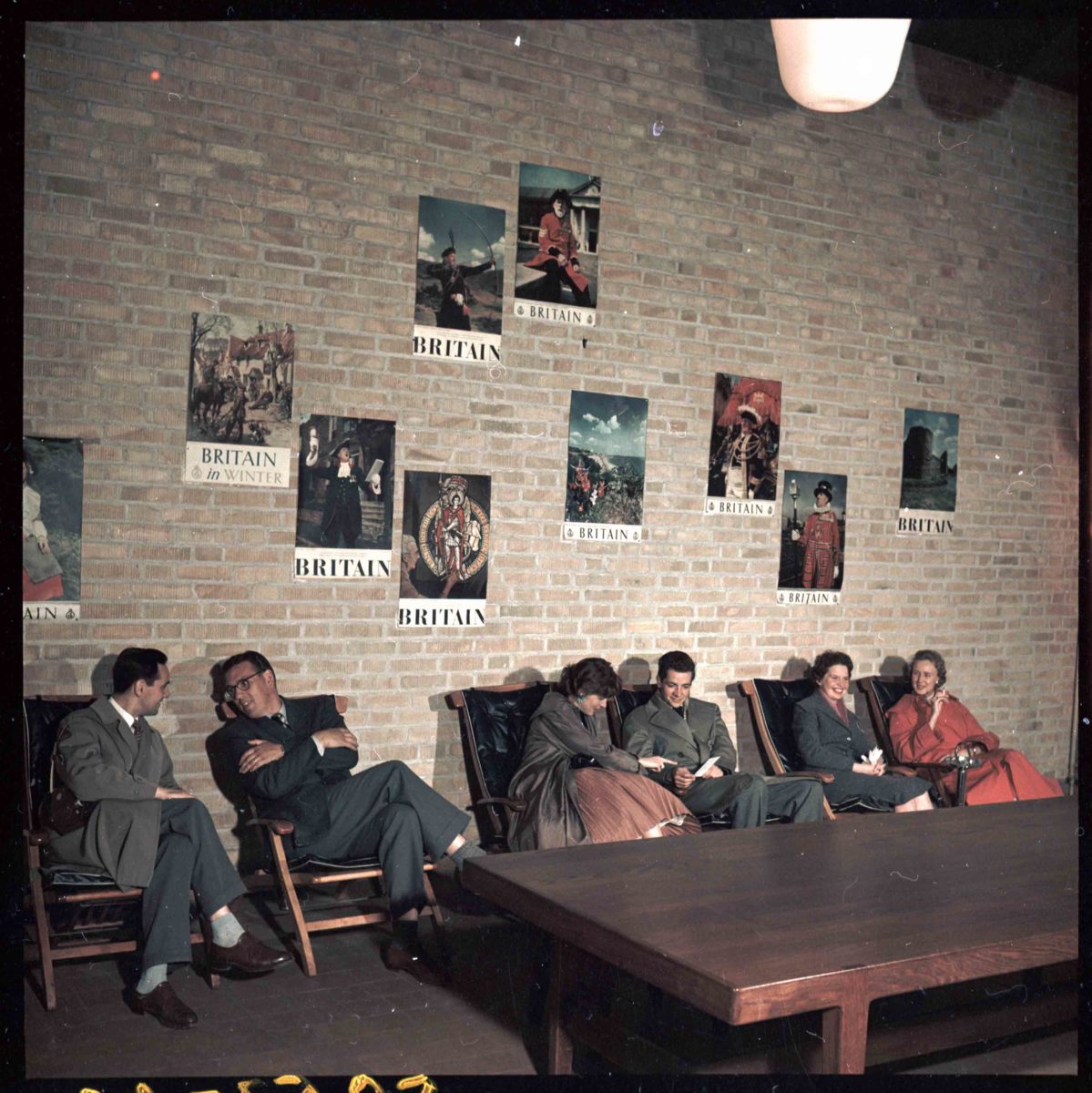 Tillhör en samling bilder under rubriken "Till England med Svenska Lloyd". På denna bild syns en grupp människor sittandes i Svenska Lloyds passagerarvänthall vid Majnabbeterminalen i Göteborg. Från Majnabbeterminalen, som stod färdigbyggd 1951, avgick Svenska Lloyds fartyg till England.