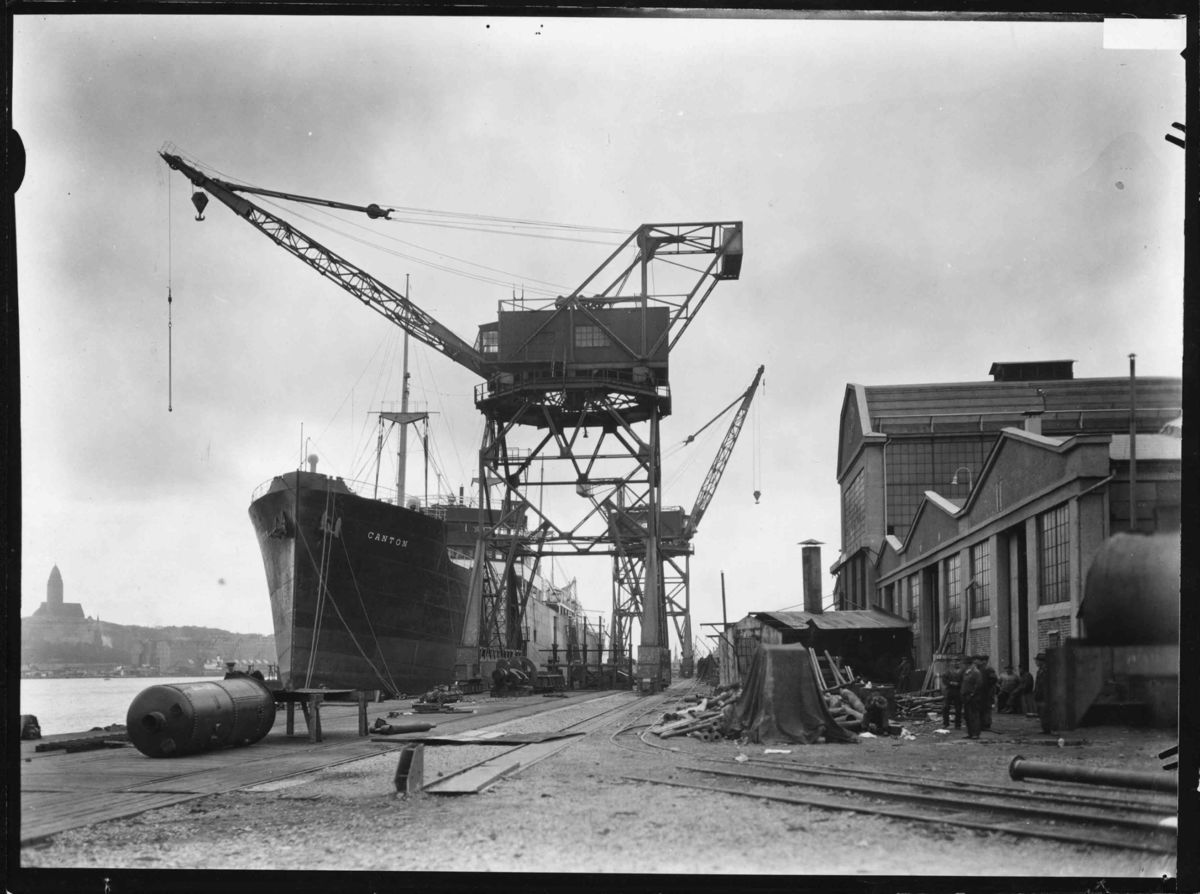 Till höger på bilden syns några byggnader på Götaverkens område. I mitten står en kran och längs med kajen till vänster ligger fartyget CANTON. I bakgrunden skymtar Masthuggskyrkan