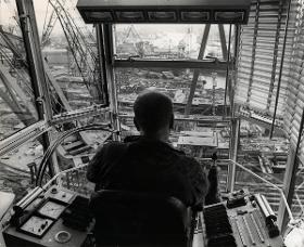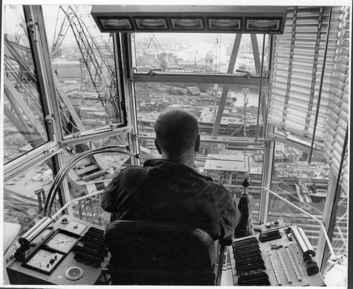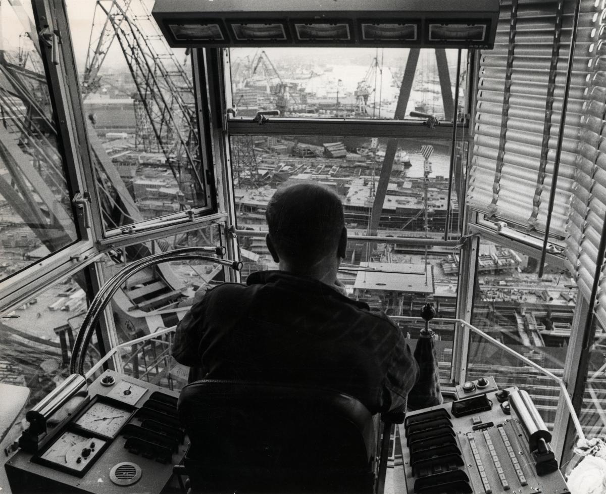 Vy över norra älvstranden från Eriksbergs bockkran som installerades 1969. Älvstranden är vid fototillfället fortfarande tungt industrialiserad, med de tre varven Eriksberg, Lindholmen och Götaverken fortfarande aktiva. Tio år senare var samtliga varv, förutom en liten del av Götaverkens reparationsverksamhet, avvecklade. Området förvandlades till en industriell ödemark innan en ombyggnad med bostäder och kontor inleddes. Eriksbergs bockkran står kvar och användes under en period för bungy-jump.
