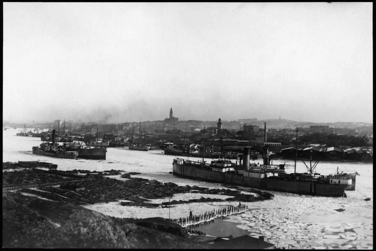 På bilden syns flera fartyg, de flesta ångfartyg men även några segelfartyg kan skymtas. Närmast i bild syns lastfartyget SYDIC som tillhörde Transatlantic. Fartygen ligger i Göteborgs hamn på vintern 1917 och alla har neutralitetsmärkning på grund av första världskriget. Fartygen är upplagda i väntan på fred och en varmare årstid.