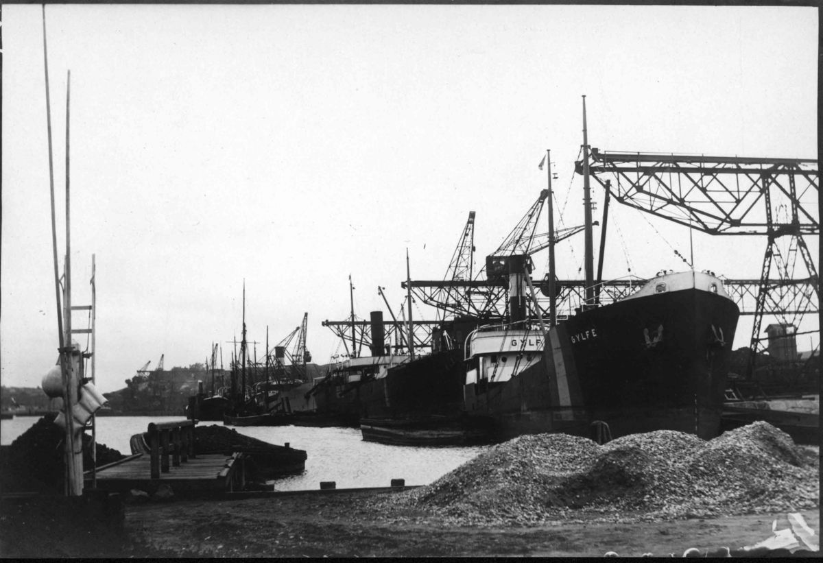 På bilden syns flera fartyg i Sannegårdshamnen år 1917. Alla har neutralitetsmärkning. Närmast ligger lastfartyget GYLFE och bakom EXCELSIOR
