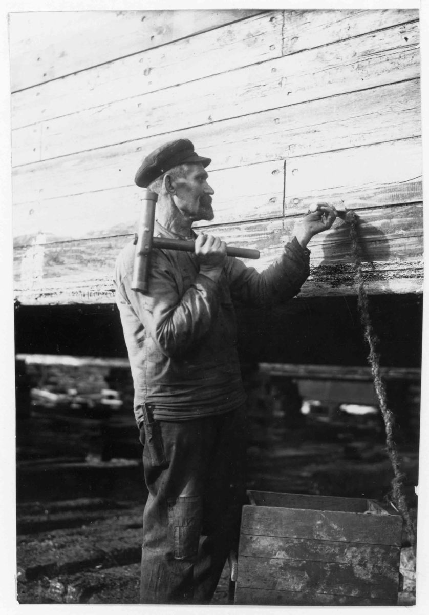 På fotografiet syns en varvsarbetare som arbetar med att dreva ett segelfartyg av trä. Fotografiet har tillskrivits föreställa arbete vid Kustens varv och är daterat till 1921. Vid denna tid var dock verksamheten vid Kustens varv nedlagd, varpå det är troligt att antingen platsen eller dateringen är felaktig