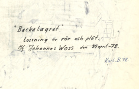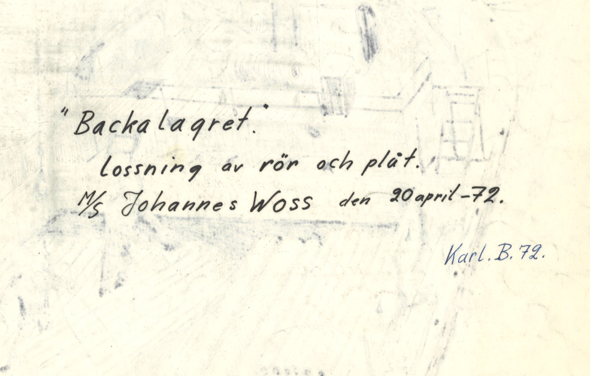 Påskrift: "Backalagret" Lossning av rör och plåt. M7S Johannses Woss den 20 april -72