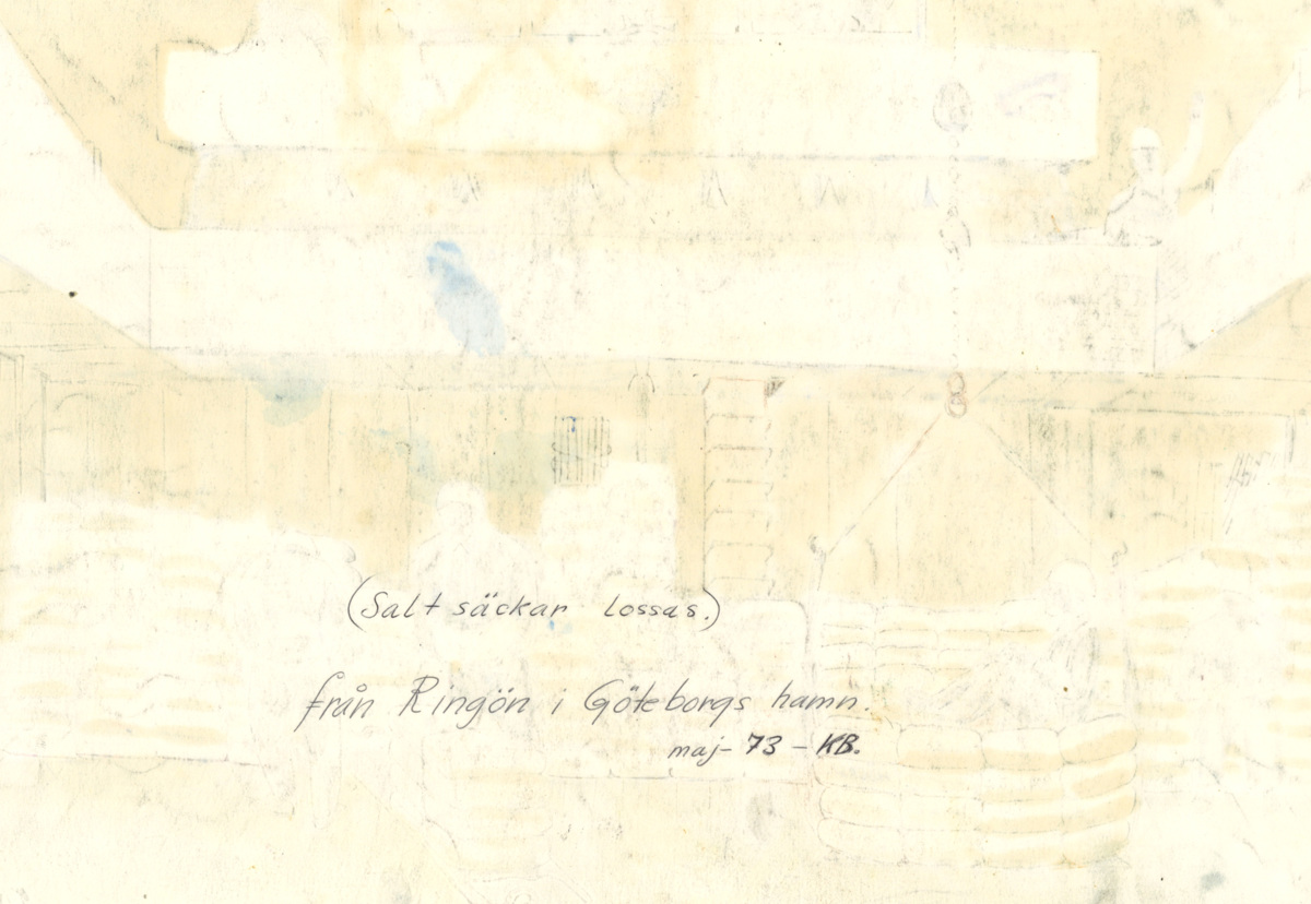 I lastutrymmet på ett lastfartyg lossas saltsäckar av fyra hamnarbetare. En av hamnarbetarna är på väg att åka upp ur lastutrymmet med hjälp av lyftkran, tillsammans med ett antal saltsäckar (det enda sättet att ta sig upp). En hamnarbetare syns uppe till vänster, på fartygets däck, och vinkar singnaler (sannolikt till lyftkranens förare). På teckningen syns också en besättningsman på fartyget, på bryggan, samt en besättningsman som tvättar fartyget.