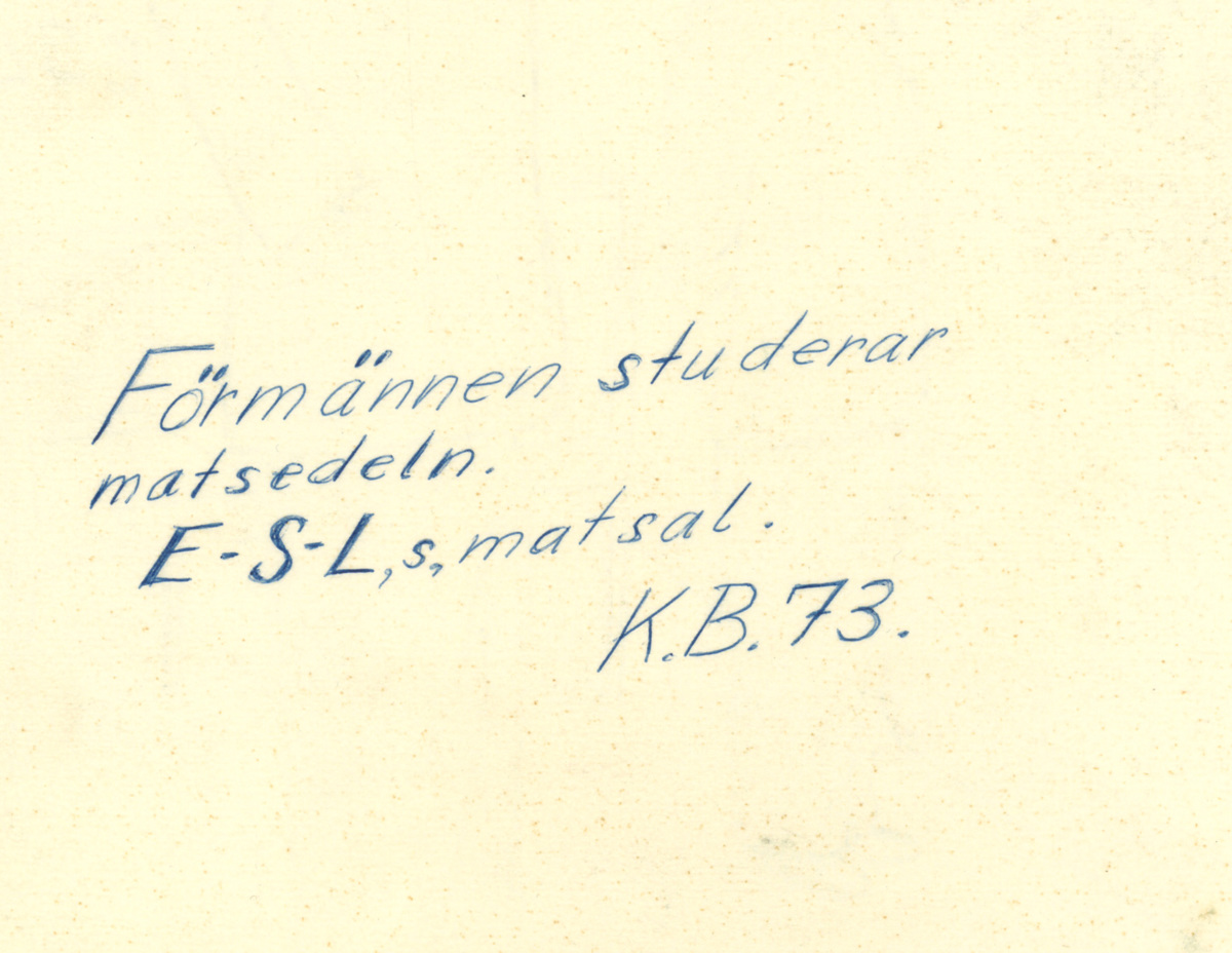 Påskrift: Förmännen studerar matsedeln E-S-L,s matsal. K.B.73.