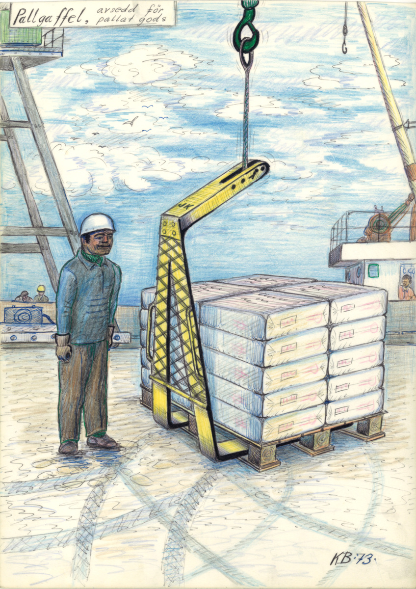 En hamnarbetare i arbetskläder och vit hjälm står bredvid en lastad pall och en pallgaffel. Pallgaffeln användes för att lasta och lossa pallat gods i sin helhet, så att godset kan ligga kvar på samma pall under hela transporten. Därmed minskas på arbetsmoment och tid sparas. I bakgrunden syns delar av en kajkran och i högra hörnet skymtar en man sittandes i en kur.